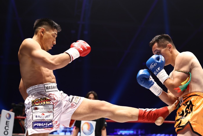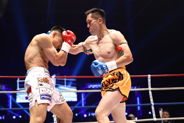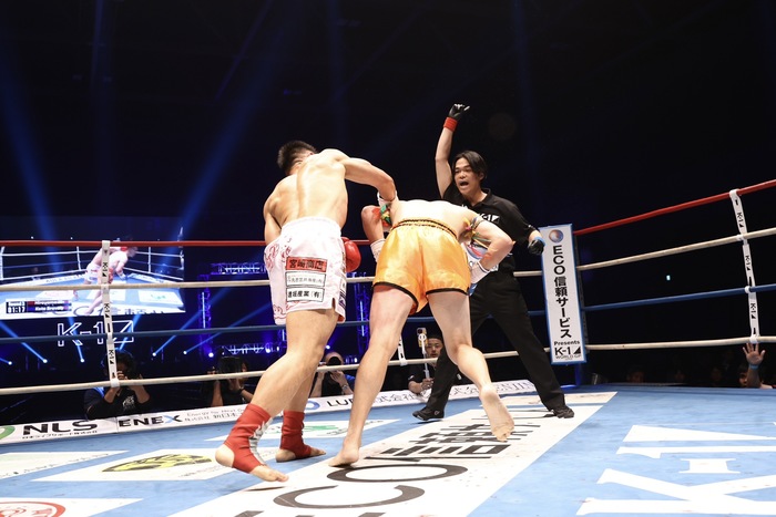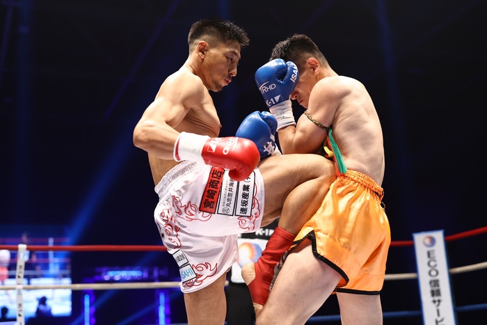平山はジャブ、左フック、近距離で右アッパー。前蹴りも放ってKO-TAを下がらせようとする。近付けないKO-TAは右ローを蹴る。平山はガードの上から長いジャブを打ってKO-TAを止め、右アッパーをねじ込み、ローを蹴り、前蹴りで突き放す。