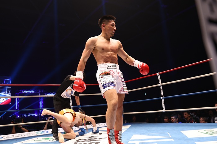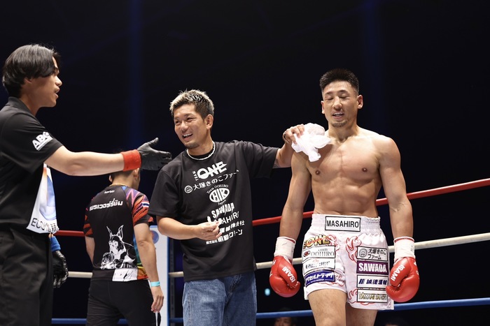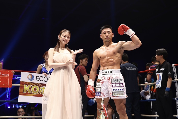 一気に足を止めての打ち合いとなり、平山が右フックから右アッパー、右フックから左フック、そして最後は右フックでKO-TAをなぎ倒し、豪快なKO勝ちを飾った。セコンドの皇治も笑顔を見せていた。