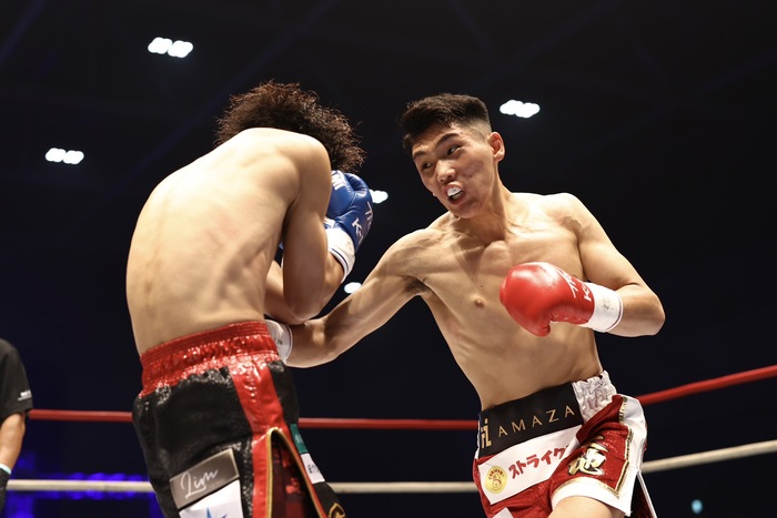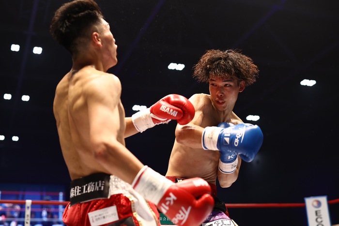 1R、大地はジャブを突いて右ストレートを伸ばし、左ボディにつなげたところへ一志が左フックのカウンターでダウンを奪う。詰める一志が左右フック、左ボディ、左ミドルも大地は下がらず左フック、左ボディを返す。一志は右カーフ連打から右フック、大地も左フックを返す。互いに下がらず左右フックを打ち合う。大地の左フックがクリーンヒットし、一志がグラつきまたも逆転KOかと思われたが堪えた。