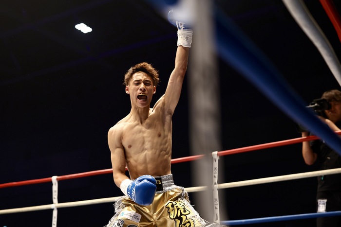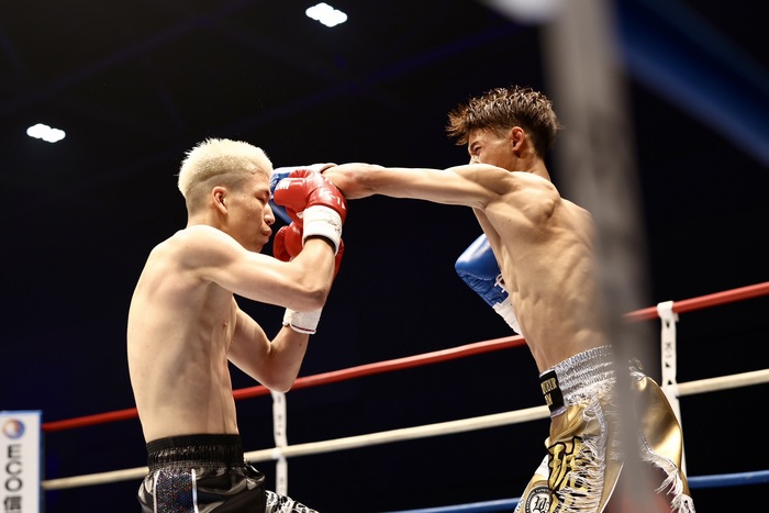 1R、サウスポーの琥伯に湯桶が右インロー、すかさず琥珀がワンツーを打つ。湯桶が左フックで入っていき、その左フックでダウンを奪う。仕留めようと前に出る湯桶に琥伯が右フックから左ストレート、さらに右フックでダウンを奪い返す。