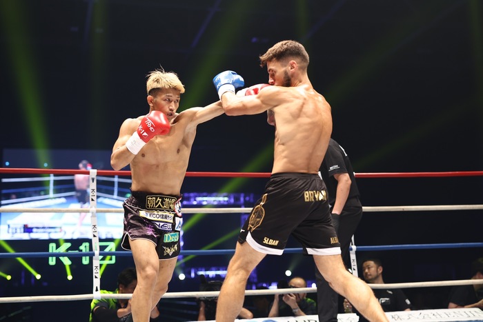 1R、朝久はサウスポーに構えて左ミドル。前蹴りを出しながら前へ出る朝久にラングは右ストレート。すぐに左ローを蹴り返す朝久。残り1分、朝久が前へ出て左フックと前蹴り。