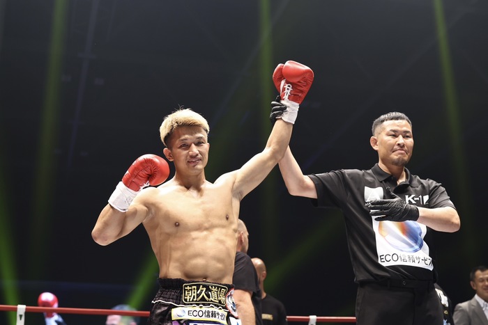 残り20秒を切ったところで朝久が左前蹴りから左フック、ラングが前へ出るところへ左ボディでダウンを奪う。もんどりうって倒れるラング。それでも立ち上がると朝久はコーナーへ詰めて左ボディと右フックの連打。最後は左ボディでラングを仕留めた。