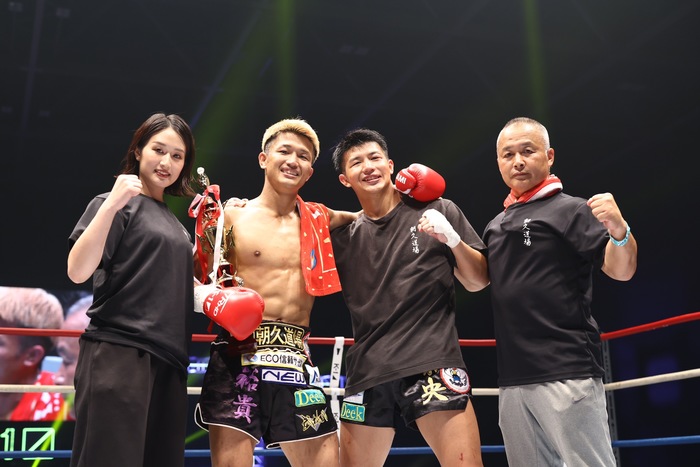 朝久はマイクを持つと「KO出来てうれしいです。ただ、今回の試合1Rで必ずボディで倒すと決めていました。その理由があって、僕はスパーリング中に泰央のあばらを折ってしまいました。それでも弟が一緒に立ちたいということで、一緒に出ると弟が決めてくれました。でも昨日ギリギリ計量クリアしても怪我が治ってなくて弟は本来の力の3割も出せていないと思います」と、前の試合で判定勝ちした泰央があばらを骨折していたことを明かした。泰央は号泣。