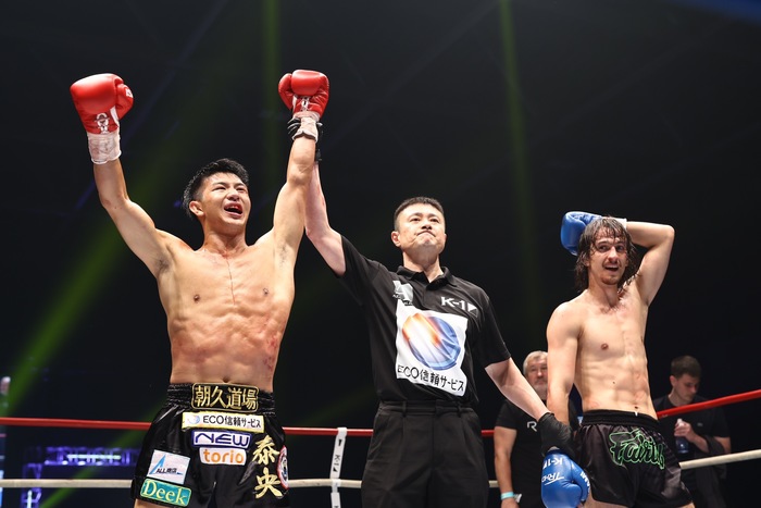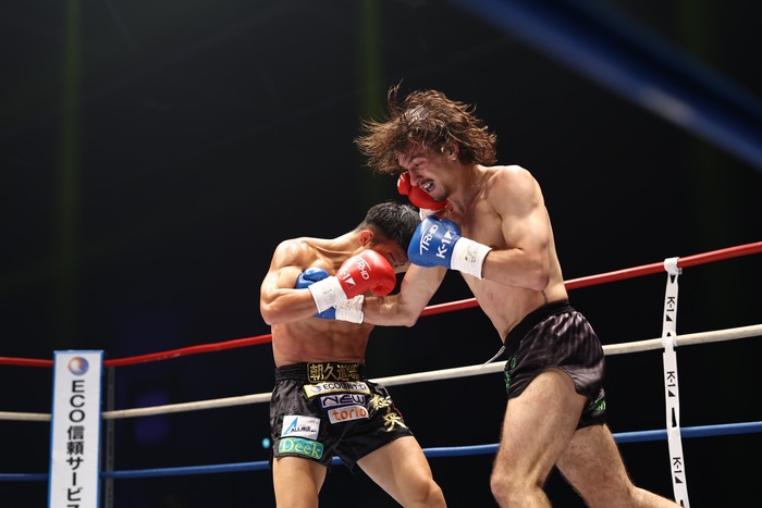 1Rいきなり前へ出て蹴りを放つ朝久。クワチは全く慌てた様子はなく左フック、左ボディを打つ。朝久も左フック。バックハンドブローも放つが空振り。両者ともスイッチを多用する。前に出る朝久はワンツー、クワチは右インローと右ミドル。サウスポーに構えた朝久は左足を前へ出しながらの左ストレート。朝久の左インカーフにクワチが下がるが、強烈な右ミドルを蹴り返す。クワチのバックハンドブローに朝久は飛び込んでの左右ボディ、右ストレート。