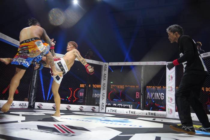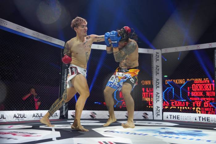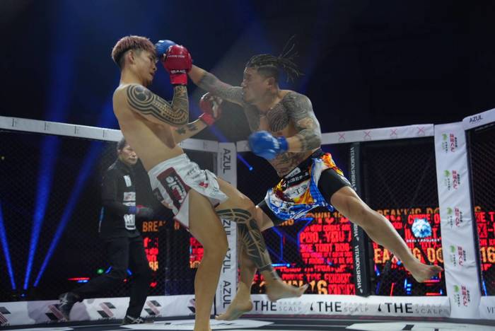 空手ベース、サウスポー構えの長身から左の蹴り、ヒザのシモミシュランに、モギは剥がしながら跳び上がるように右で入ろうするが、左ミドルを当てるシモミシュランは、左の打撃でモギをコントロールしてゴング。
