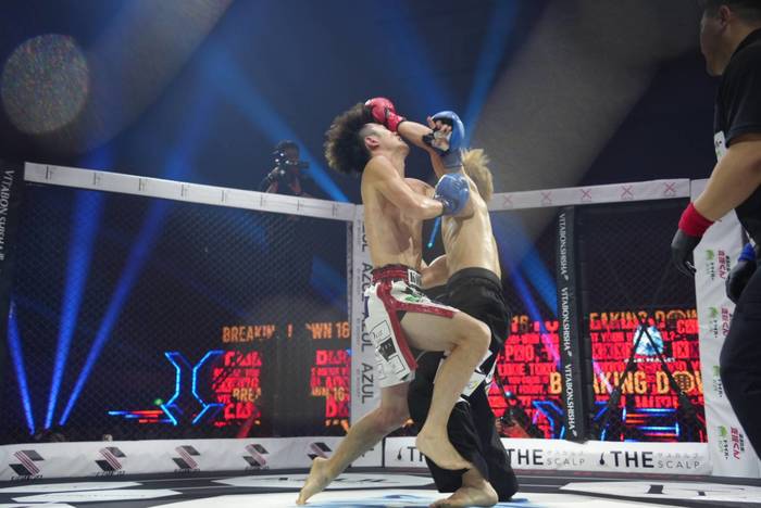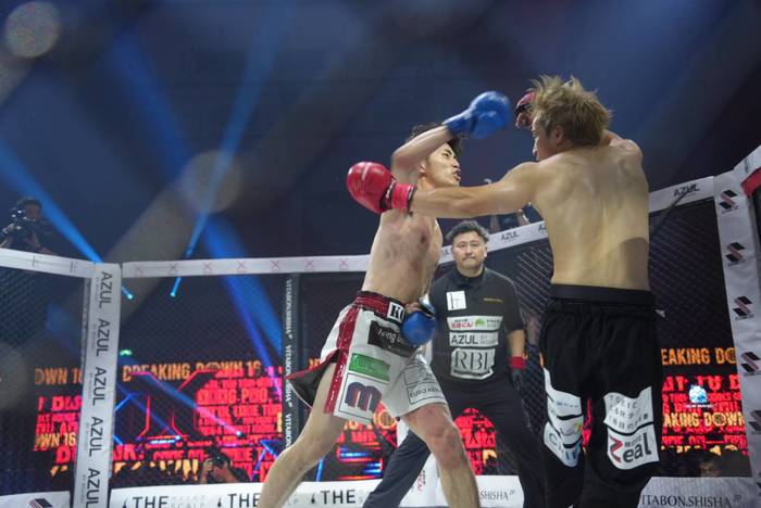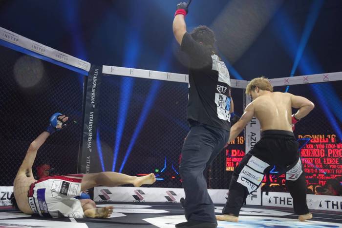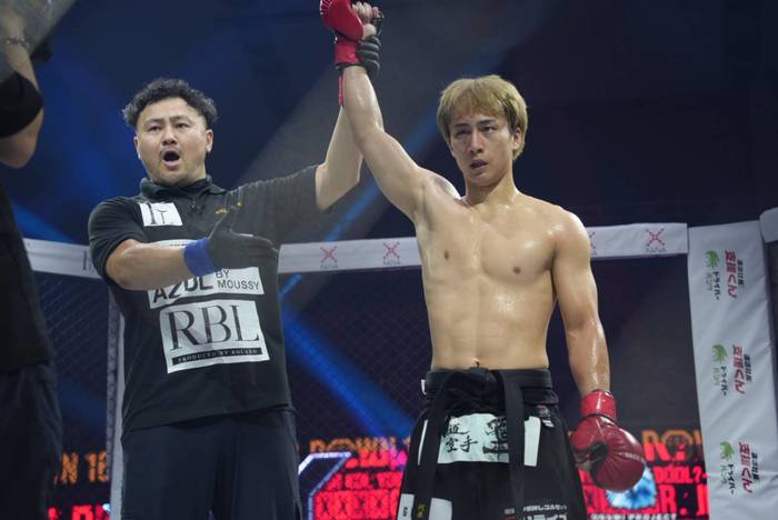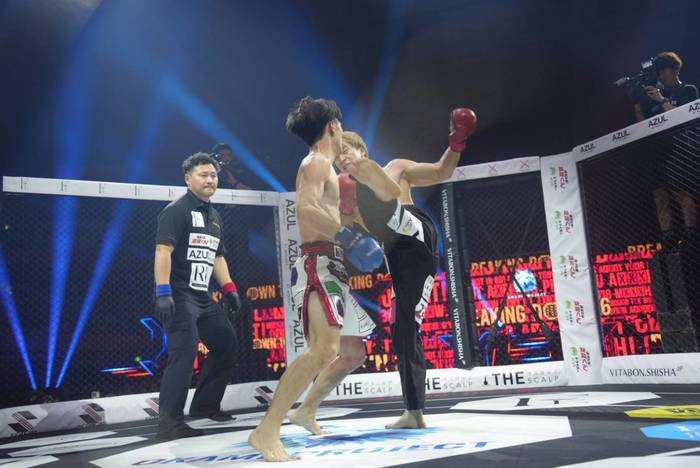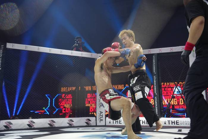 ドクターチェック後、前に出る池田に大野は胴廻し回転蹴りでゴング。延長R判定5-0でダウン奪った大野が勝利。試合後、ケージインした井原と対戦の約束をかわした。