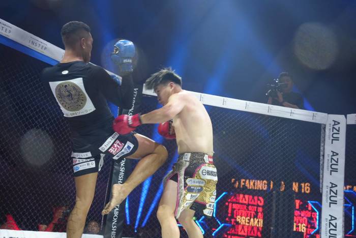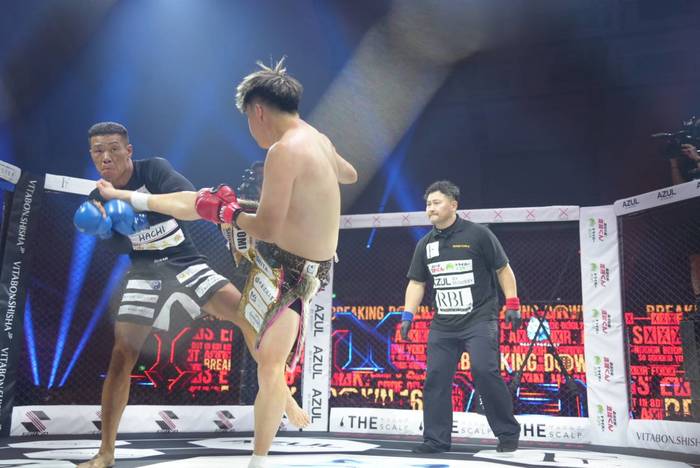 先に右カーフを当てる寿希也。生田も右を振るが、かわして右を当てる寿希也は右ハイ、さらに左ボディ。そこに右ヒザを合わせる生田。