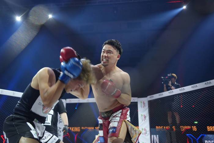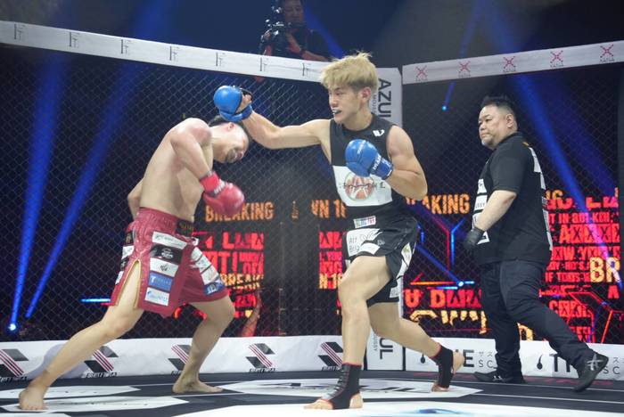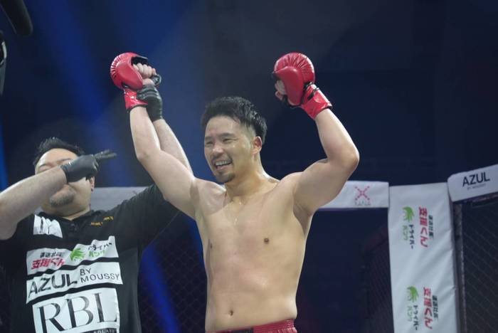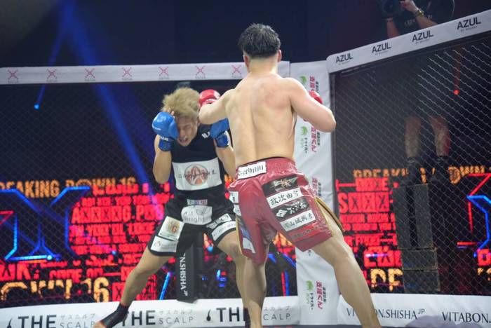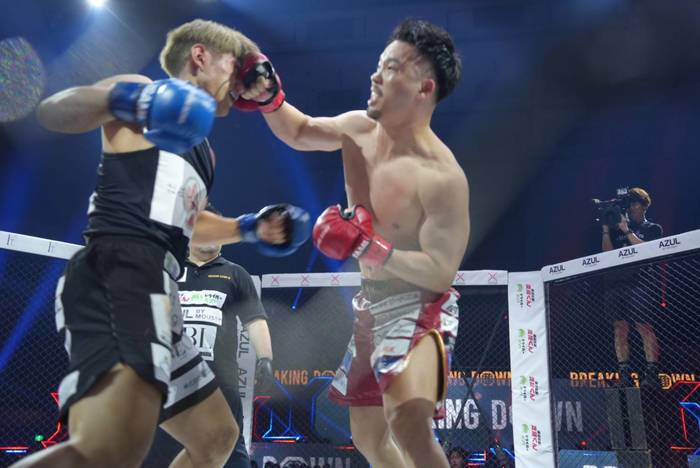 ともにオーソドックス構え。たつは左の蹴りから、山本は回転速くストレート・左ボディ、左フックを当てる山本に、ケージ背に被弾したたつも打ち返し。判定は4-0で、元OPBF東洋太平洋バンタム級王者の山本が勝利。