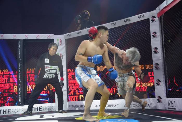 3R、後ろ蹴りのジョリーに右カーフの秋元。首投げに行くが潰したジョリーが上からパウンド。スタンド。秋元の右にジョリーも右を返して押し込み、ゴング。