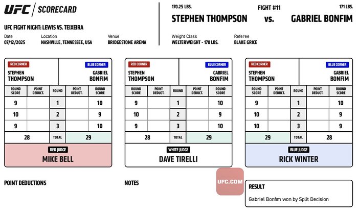 判定は29-28×2, 28-29のスプリット判定でボンフィムが接戦を勝利し、3連勝。両者ケージに上がり、トンプソンは笑顔でボンフィムの手を挙げた。