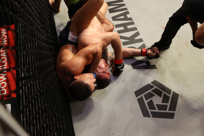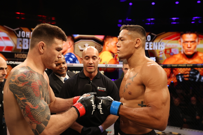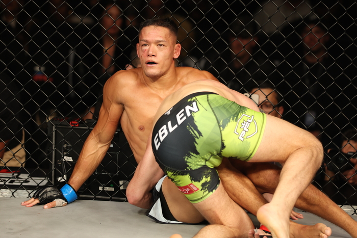 ケージ背に差し上げるスティーニスに自ら離したエブレン。スティーニスのパンチにエブレンは顔面から出血も、右フックからダブルレッグへ。がぶりのスティーニスは突き放すが、なおもシングルレッグに入ると細かいヒザ。