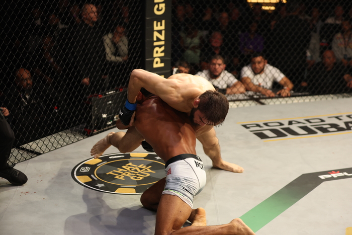 1R、サウスポー構えからワンツーの左を突くAJ。さらに左ハイ。その蹴り足を掴んでテイクダウンのマゴメドフ! 三角絞めを狙うAJに作らせないマゴメドフが上に。ハーフで背中を着くAJ。細かく下からパンチも、押さえ込むマゴメドフに腰を切りフルガードに戻すAJ。