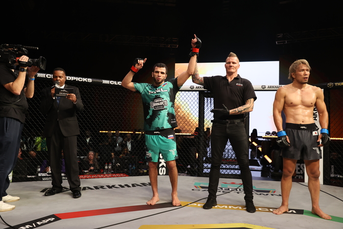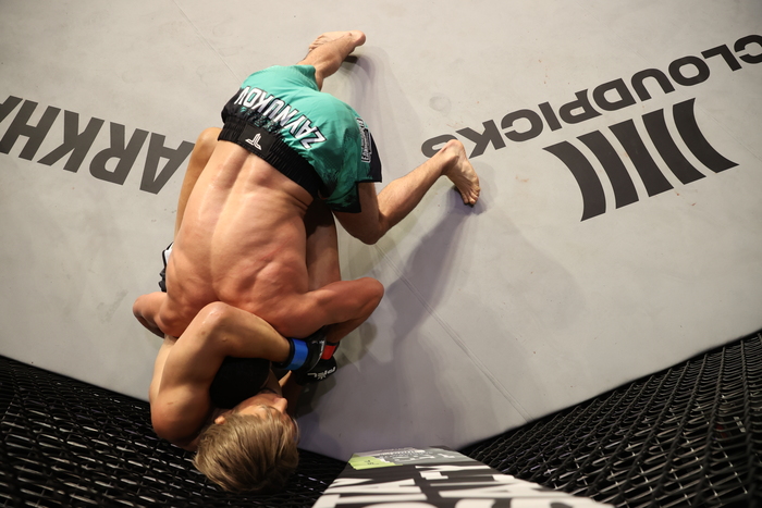 泉の左ジャブの打ち終わりにワンツーの右を当てるザイヌコフ。泉はシングルレッグにテイクダウン。そのまま跳ね上げるザイヌコフ。ともに立ち上がりからがぶる泉はその圧力にギロチンチョークで引き込むが下に。ザイヌコフはマウントを奪うが、泉はシングルレッグでレッスルアップ! ケージに押し込み、苦しい時間帯にシングルレッグへ。切るザイヌコフにクリンチアッパー。体を入れ替えるザイヌコフは離れる。サウスポー構えから左三日月蹴りのザイヌコフはオーソに戻して左ジャブを突く。ザイヌコフのラウンドに。