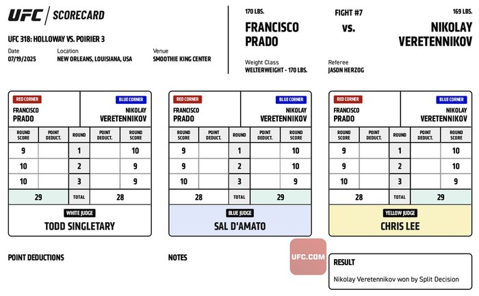 #UFC318 Official Result: Nikolay Veretennikov (29-28, 29-28, 29-28 | @VeretennikovMMA) defeats Francisco Prado via Split Decision.