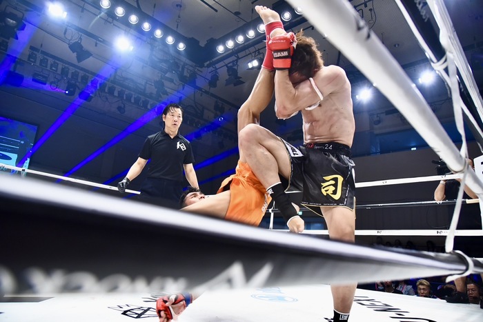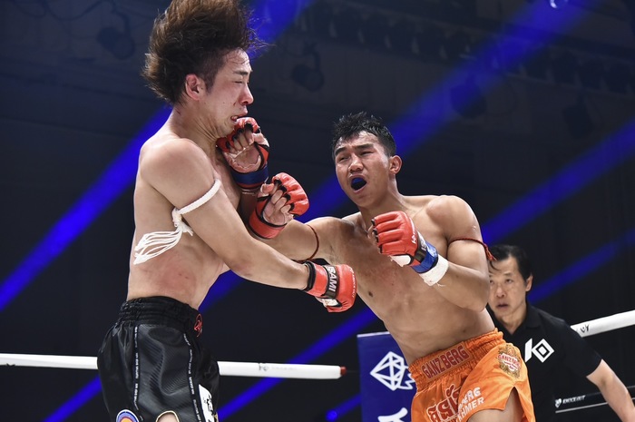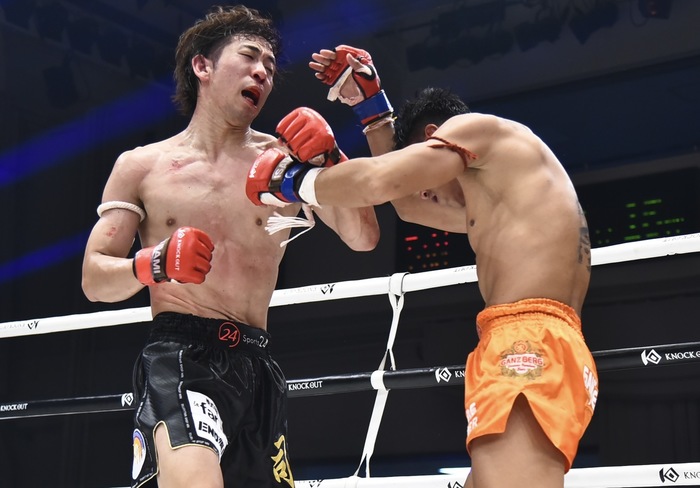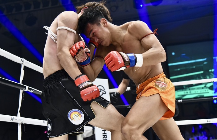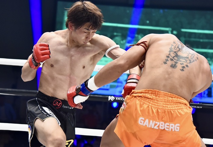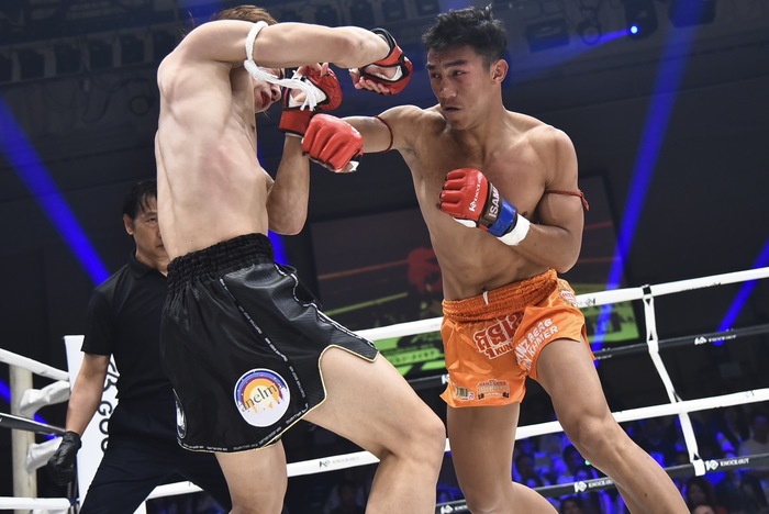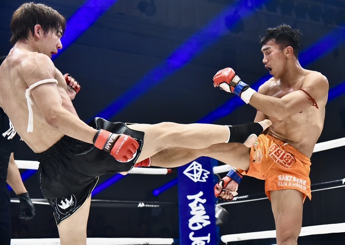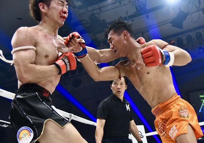 1R、前に出るムンは縦ヒジを突き立て、サウスポーの小林もヒジで応戦。ムンはボディストレートを放って距離を詰めると右ヒジを叩きつけ、小林を流血させる。小林はジャブ、右フックで迎え撃つがムンの前進は止まらない。どんどん前へ出るムンは飛びヒザ蹴りも放つ。ムンの右ヒザが小林の急所に当たったが、レフェリーのストップはかからかなったためムンはヒザを連打。