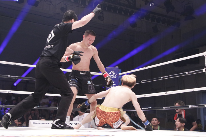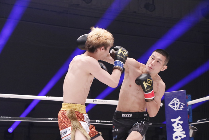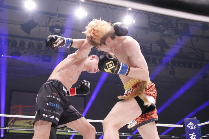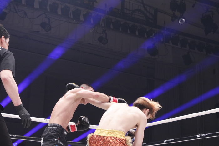 1R、木村はスピードと回転力を活かしたパンチを繰り出していき、左ミドルも蹴る。パンチをまとめる木村に大谷はブロックを固めて受けながらも、右ローと右カーフをこつこつと蹴っていく。終盤、ワンキャッチの状態から大谷が右フックをヒットさせ、ダウンを奪った。