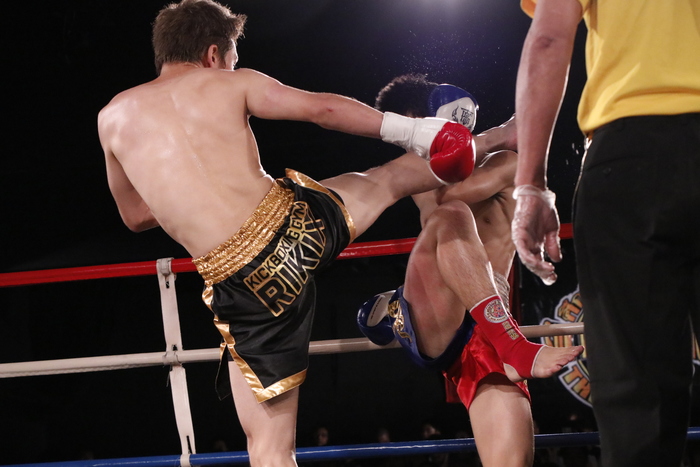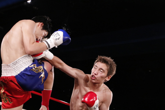 2R、ギアを上げたゲンキは左ミドルをバンバン蹴っていくが、嶋津の右ボディストレートで身体がくの字になり、嶋津がダウンを奪う。立ち上がったゲンキに嶋津は飛びヒザなどで追い込んでいったがゲンキも左ミドルで反撃。