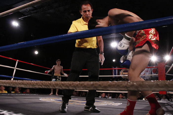 1R、嶋津はサウスポーのゲンキに対して左側へ回り込みながら右ボディストレートを狙う。コーナーに追い込んでのパンチのまとめも。