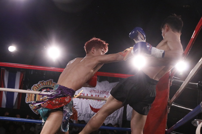 3R、左右フックで攻め込む高橋に、日本猿は逃げ切り体勢か組み付く。高橋はヒザ蹴り。右ボディストレート、左右フックで前へ出る高橋。