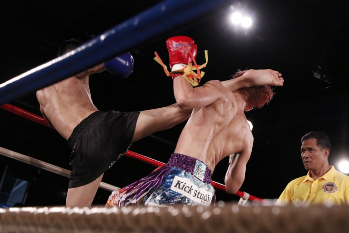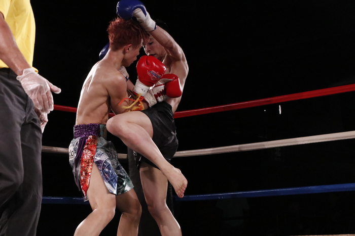 2Rもハイキックを狙う日本猿に高橋は右ストレートを放って行く。首相撲の展開も多くなり、ヒザの蹴り合いでは負けていない高橋だが、日本猿がコカす。