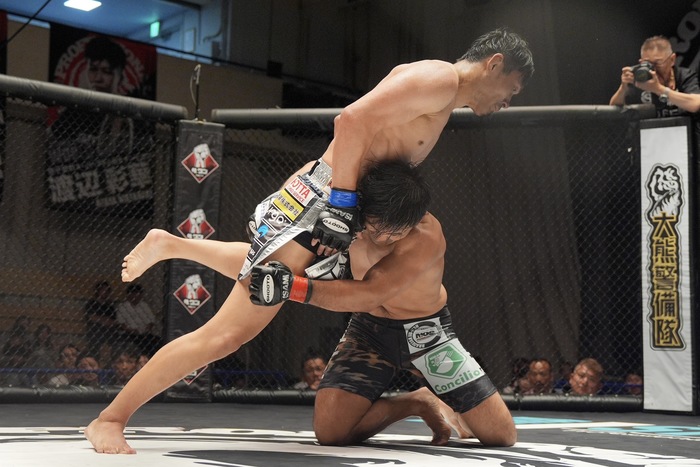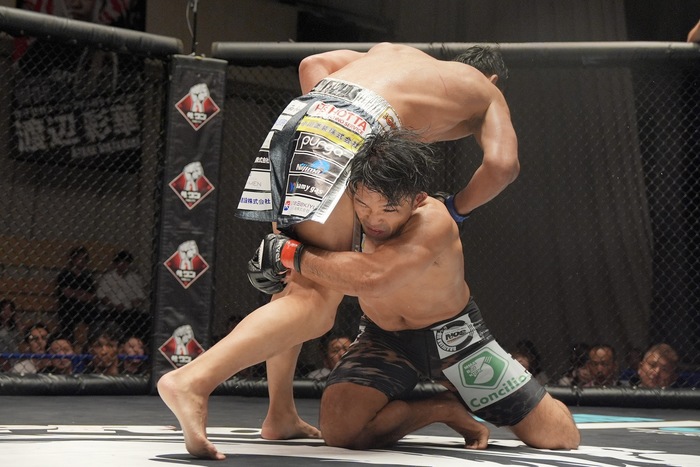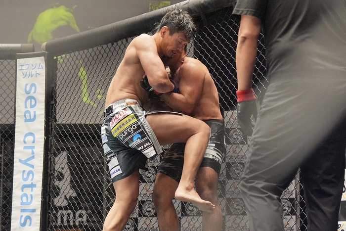 圧力かける住村にソーキはニータップでテイクダウン。すぐに立つ住村は正対して体を入れ替えバッククリンチ。ヒザを突く住村。ソーキは正対して離れ際に尻もち、そこで蹴り上げを当てるソーキはシングルレッグで立ち上がり。