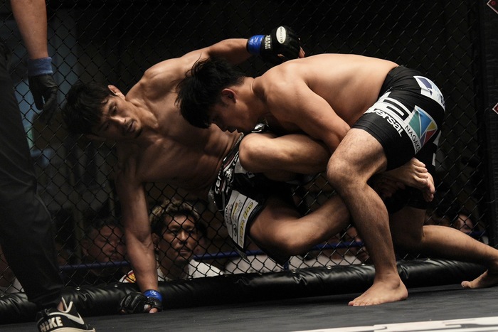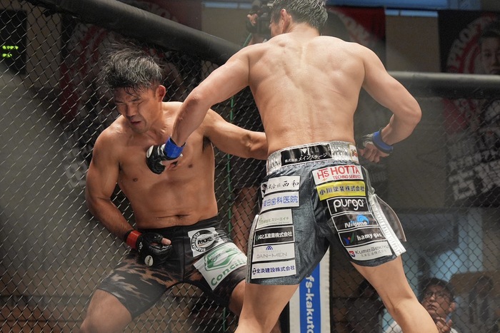 詰めるソーキに、住村は左回り。ソーキの左をかわした住村は組んでヒザ。ソーキは四つから小外がけテイクダウン! 残り15秒をトップから細かいパンチもホーン。