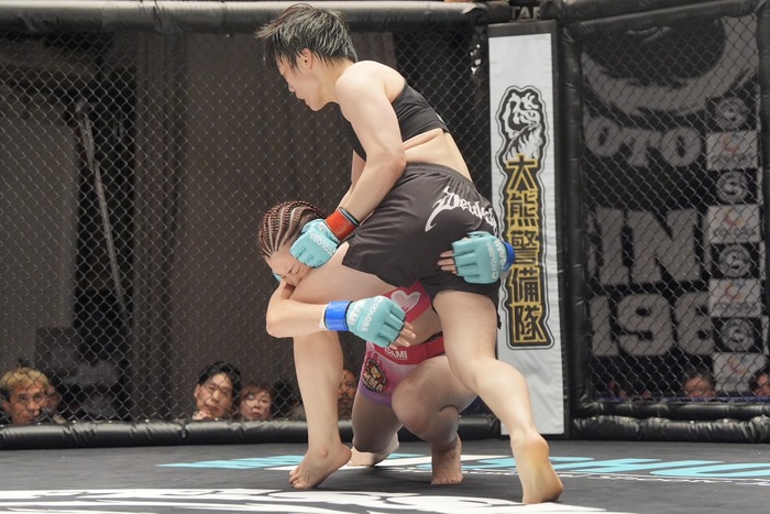 スタンドでパクは左ジャブを当ててボディ打ちも。宝珠山のシングルレッグを切ってマウント。左枕で肩固めも狙い、パウンド、ヒジを連打! 宝珠山も半身になって耐える。