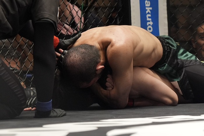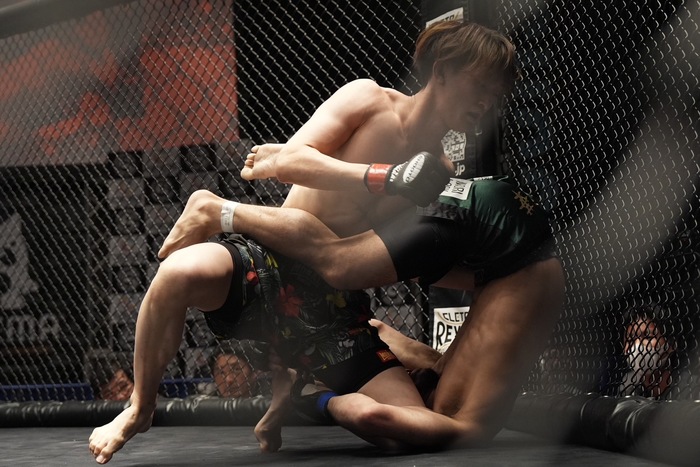 1R、先にサウスポー構えから左を突くシモン。安芸は右でダウンを奪うと、立つシモンは組み。四つから安芸は大振りのフックに左も当てるが、詰めるシモン、安芸は跳びヒザもスリップして下に。サイド奪うシモンは腕十字狙いも外して立つ安芸。