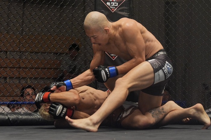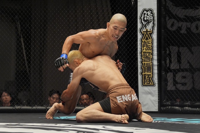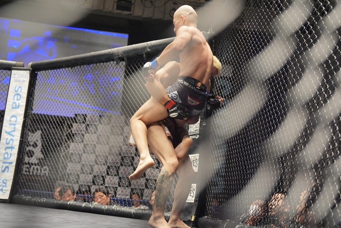 1R、オーソの青柳にサウスポー構えの中野は左でダウンを奪うも立ち上がる青柳。中野の詰めにダブルレッグテイクダウン。下の中野は足を戻して立ち上がるが、すぐに詰める青柳がケージに詰めてダブルレッグテイクダウン。ハーフから細かいパウンド。