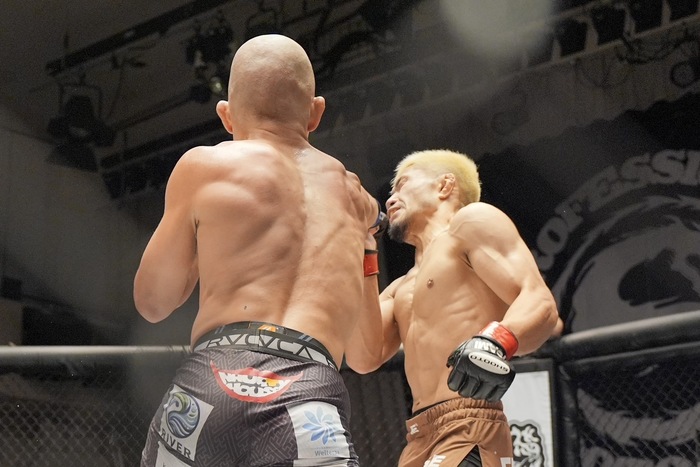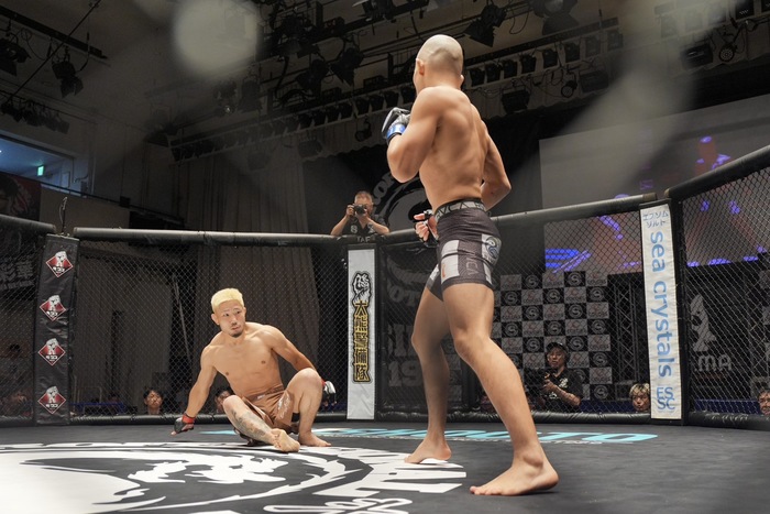 左ミドルを当てる中野。さらに右ジャブ! 青柳の詰めに左ジャブ、さらにケージに詰めて右ストレートを当てると、青柳がダウン! 中野がパウンドをまとめた。