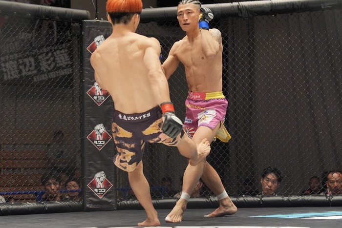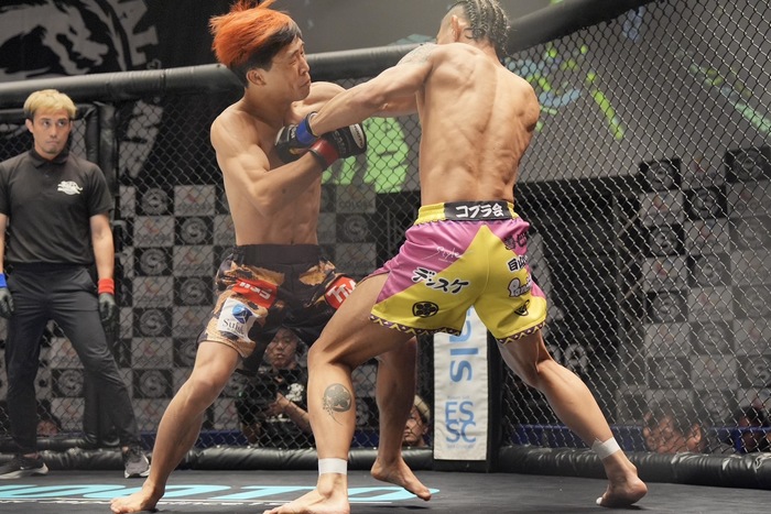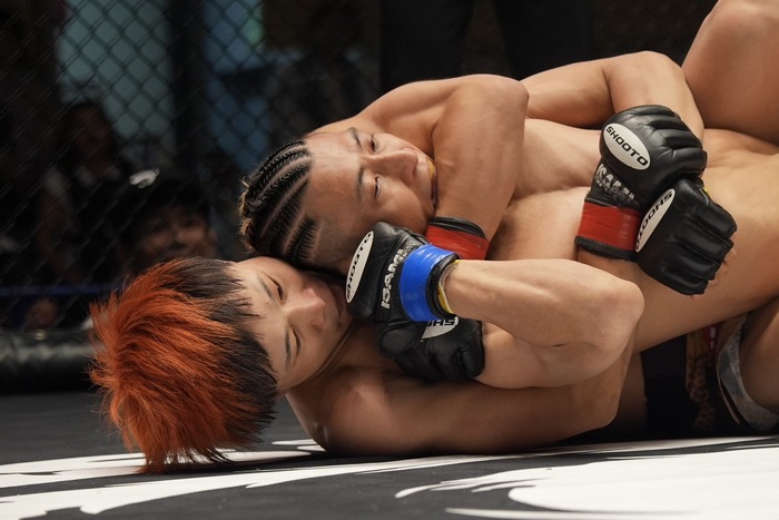 1R、ともにオーソドックス構え。左フックを当て、右カーフも行き過ぎない黒部。マッチョ・ザ・バタフライも右の蹴り返し。左フック。右で飛び込む黒部に、マッチョ・ザ・バタフライは右を合わせるが、組んだ黒部は左差しでボディロックテイクダウン。サイドからすぐにバック、ボディトライアングル。背後からパンチし、リアネイキドチョークを狙う。首を守るマッチョ・ザ・バタフライ。黒部は背後からヒジ。残りわずかで黒部は腕十字もホーン。