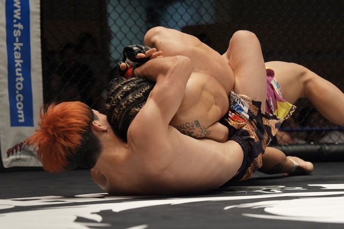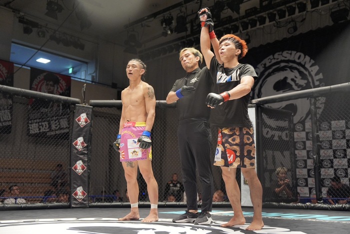 上の黒部は片固め! 側頭部に腕を当てるマッチョ・ザ・バタフライは防御。黒部はバックに移行。背後からパンチを入れながらリアネイキドチョーク、おたツイスターを狙うもマッチョ・ザ・バタフライも防いでホーン。判定3-0(20-18×3)で黒部が勝利。