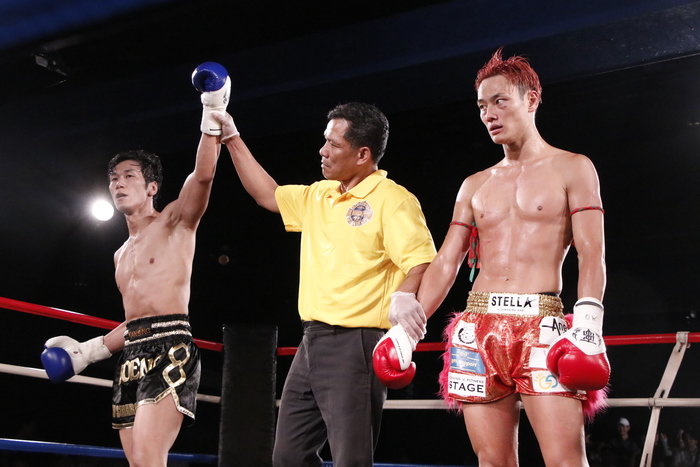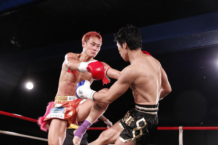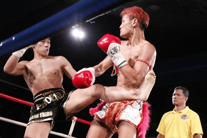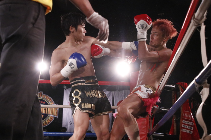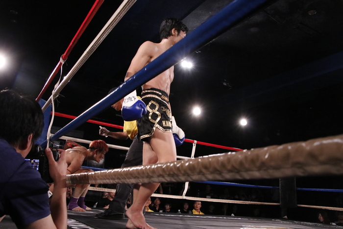 2R、ローの蹴り合いになるが、津橋はインカーフをカットされて足を戻したところでバランスを崩す。カミシロの右カーフで津橋が大きなリアクション。このチャンスを逃さずカミシロが右ローで畳みかけてダウンを奪う。立ち上がった津橋は首相撲で凌ごうとするが、カミシロが右ストレート、左フックを浴びせる。