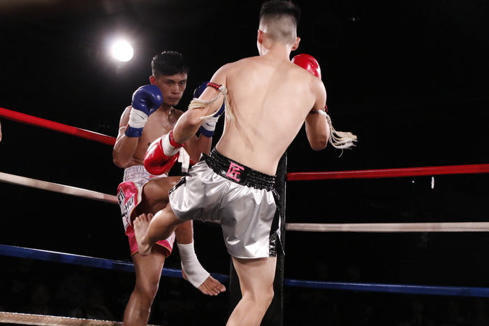 1R、匠は序盤から右ローを狙い撃ち。サウスポーのブーンは左ミドルを蹴ってくるが、それに匠はワンツーを合わせに行く。ミドルの蹴り合いからは匠がパンチにつないだ。