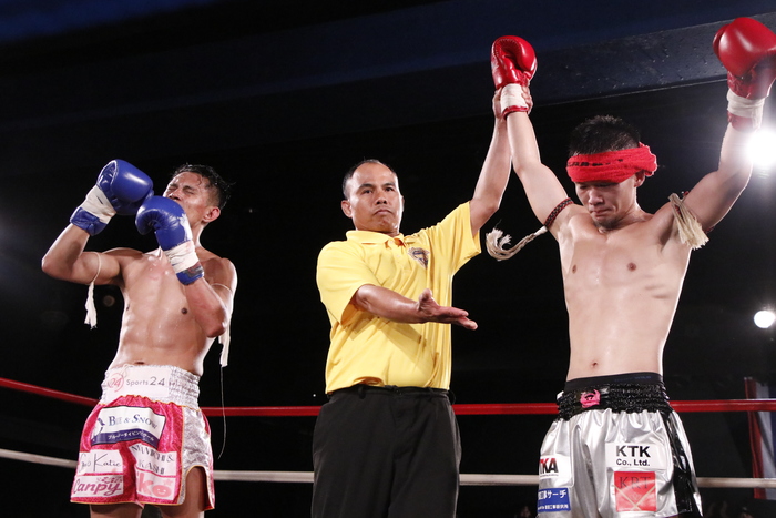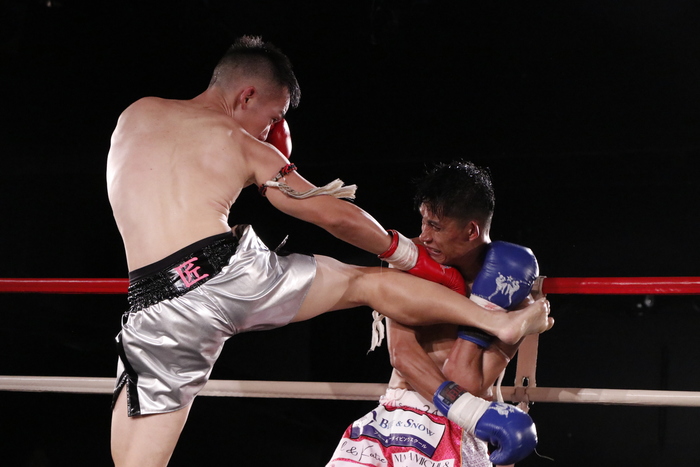 2Rは首相撲に持ち込むブーン。匠はパンチからの右ロー。ブーンは匠の入り際を狙って左の縦ヒジを放つ。これで眉間をカットした匠だが、パンチでは優勢。