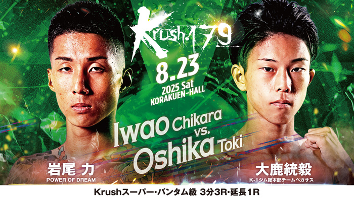 Krushスーパー・バンタム級3分3R延長1Rで、岩尾力(POWER OF DREAM)と大鹿統毅(K-1ジム総本部チームペガサス)が対戦する。