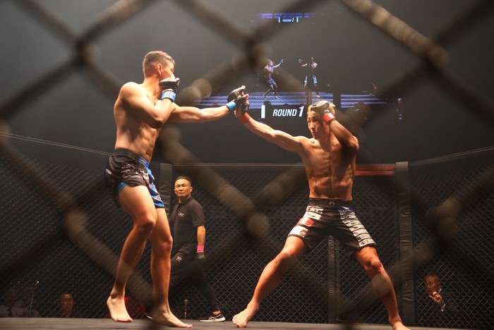 1R、試合は、アーニーの鋭い飛び込みストレートがキャプテンにヒットして幕を開ける。しかしキャプテンは即座に反応し、パンチ連打でアーニーをケージに追い込むと、腕を一本引きつけて巻き投げでテイクダウンを奪取。