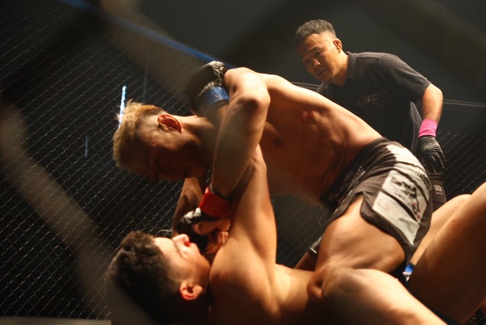 再開後、今度はキャプテンのワンツーがヒットし、そのまま大外刈りでテイクダウン。マウントを奪取し、パウンドを連打。アーニーもよく耐え、クリーンヒットを避けるが、キャプテンの攻撃は止まらず。アーニーがうつ伏せになったタイミングで、キャプテンが腕を背中側に送り込み、ハンマーロックの形に。ここでレフェリーが関節技と判断し、ブレイク。