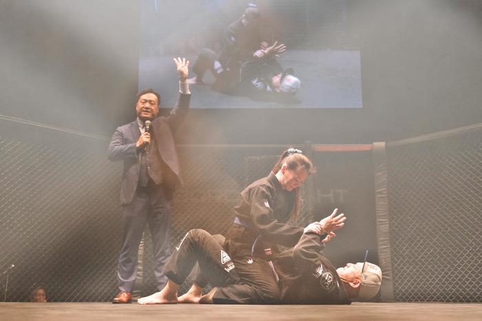 大会前にIBJJFルールのポイントシステムの説明が行われ、実演を、XBP格闘技プロデューサーの佐伯麻衣子、EDGEスペシャルサポーターガリットチュウ福島善成。解説をJIU-JITSU NAVI編集長新明佑介が務めた(text by JIU-JITSU NAVI, Photo by XBP)。