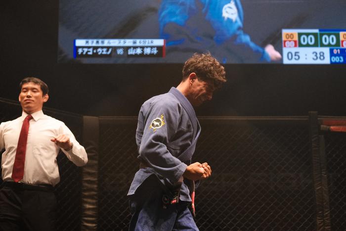 トップの山本は襟を握りながら必死にディフェンスを試みるも、チアゴは上半身を大きく反らせながら足を絞り上げ、強烈な圧力でわずか20秒という電光石火の一本勝ちを収めた。