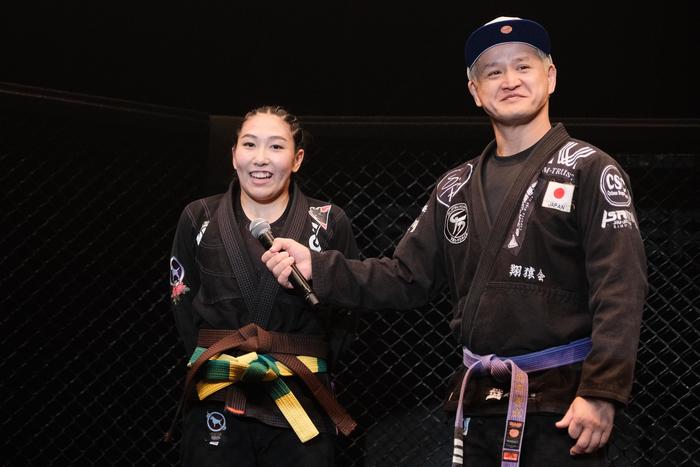 福島から勝因を問われたヘナータ・ハルミは、「自分の流れを作るのが目標だったので、計画通り全部進めて良かったです。お父さん、ありがとう」とセコンドのヘナート・シウバNFIGHT JAPAN代表にハートマーク。続けて、「今日、初めて柔術を見る方もいるかと思いますが、見て頂いた機会として、また柔術を始めてもらえたら嬉しいので、お気軽に近くの道場に足を運んでみてください」と笑顔で語った。