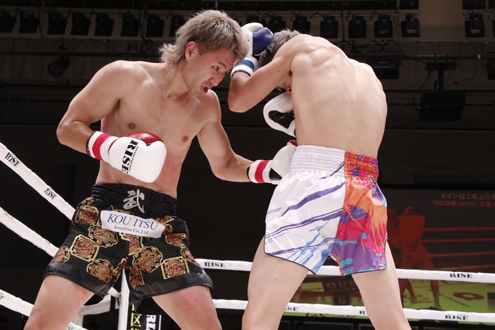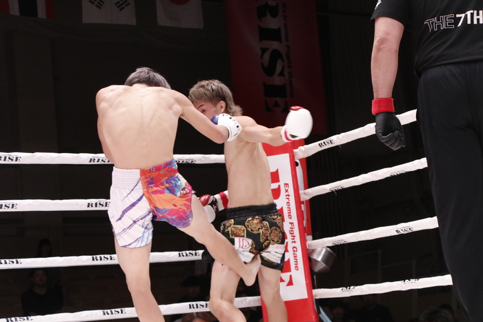 1R、ジャブを突く武に太陽は右ロー&カーフを蹴り、ワンツー。パンチからの右ローを次々当てていく太陽に武は後退するも、コーナーを背にしてのワンツーで抵抗。