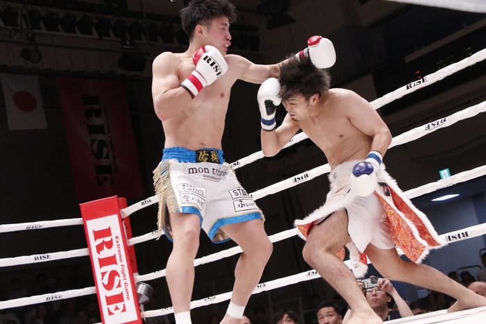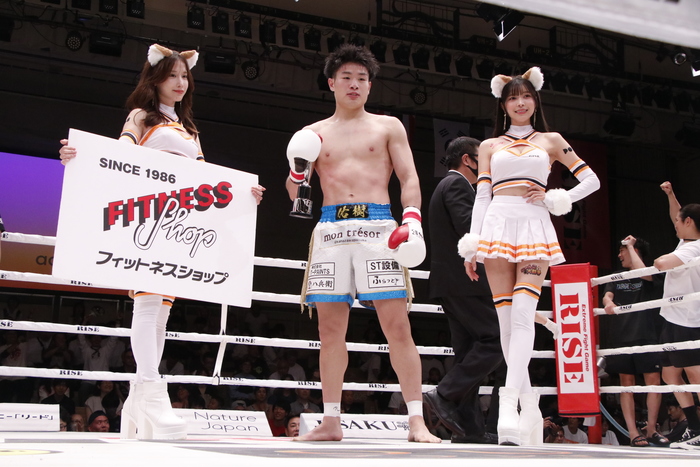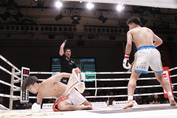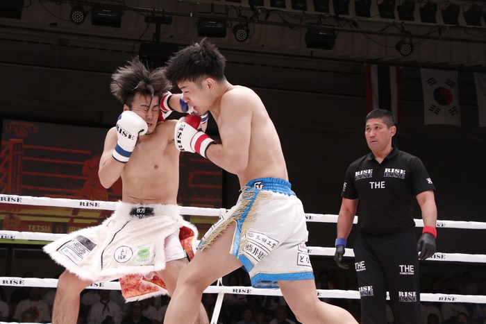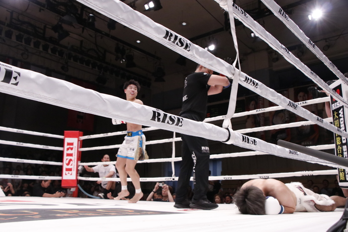 1R、田中が右ストレートでダウンを奪い、TETSUのローに合わせた左フックで2度目のダウンを追加。最後はコーナーへ追い詰めての連打でなぎ倒し、圧勝のKOとなった。