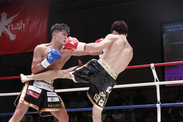 1R、内田は得意の左右ミドルを蹴っていき、村田が圧をかけて前へ出てくるとパンチの距離に入る前にミドルを蹴って組む。村田は組みの離れ際に上手く左右フックを入れ、左ボディも打つ。