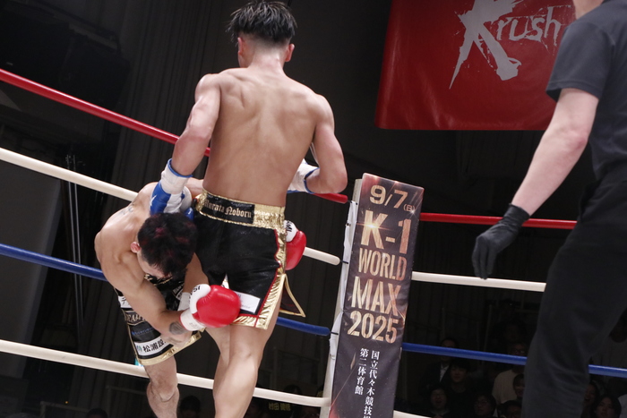 3Rも徹底して内田のミドルにローを返す村田。内田がワンツーを打ってくると左右フックで迎え撃つが、内田のバッティングとなる。村田は徹底した右ロー連打で内田を追い詰めていき、要所で左ボディを打つ。そして、村田が左ミドルからの左ヒザでダウンを奪う。