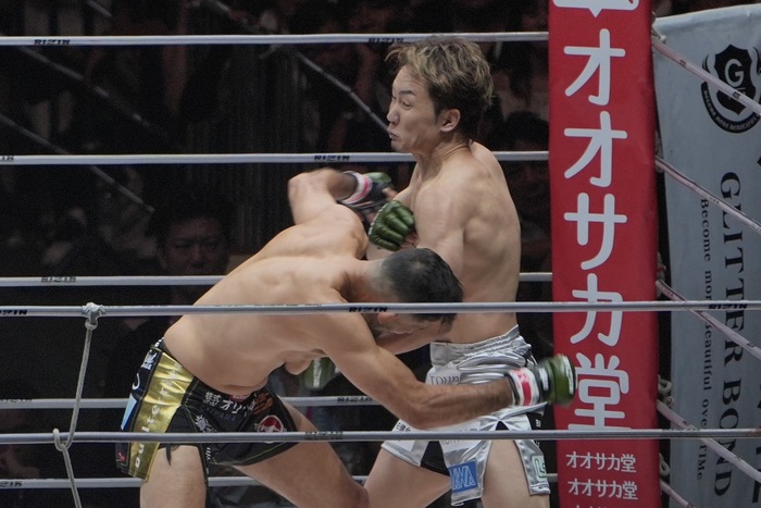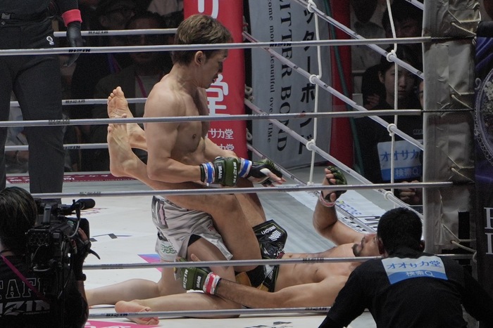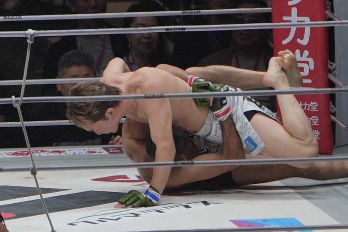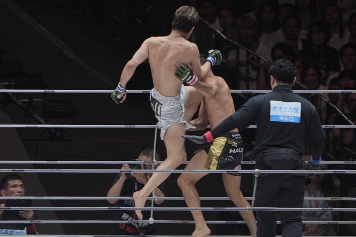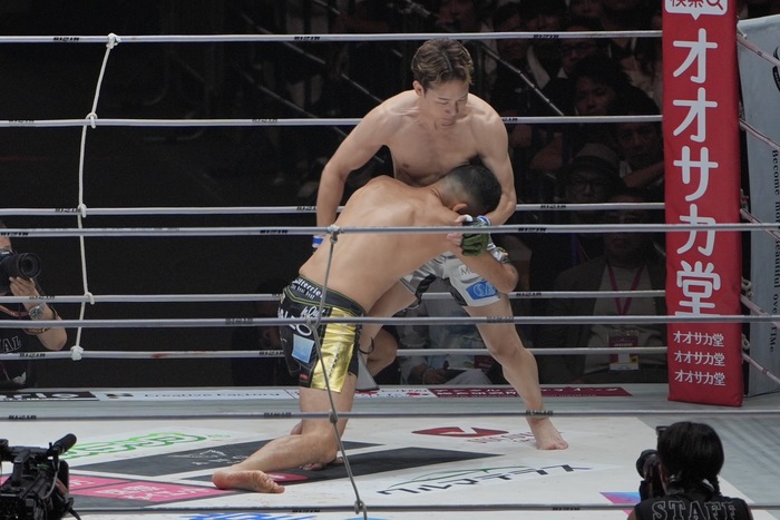 1R、サウスポー構えの朝倉が圧力をかけて左ロー。オーソのクレベルは中央で押し戻して、朝倉の左前手フックをかわしてダブルレッグ。右足を外に出す朝倉にボディロックテイクダウンのクレベル右小手でスイープして上下を入れ替える朝倉に、左差しで立ち上がるクレベル。右ローで前に出るクレベルは朝倉の右に合わせて組み。コーナー背にする朝倉にボディロックからヒザ蹴りのクレベルの、崩しにトップを奪う朝倉。パウンドも立ち上がる。