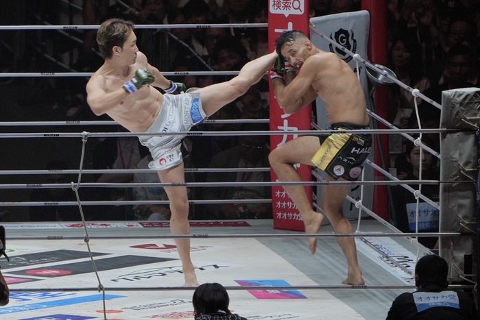 クレベルの右ロー。朝倉は左ハイからワンツーの左ボディストレート。右ローで圧力をかけるクレベルに左ボディの朝倉。朝倉は左インロー。右の関節蹴りから跳びヒザも。ゴングに笑顔の朝倉。