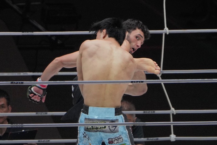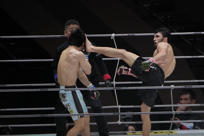 ニータップの征矢をさばいて左でダウンを奪うガジャマトフ! パウンドを被弾しながら背中を見せて立つ征矢に右前蹴り。バッククリンチを離して左右ラッシュのガジャマトフ。しかし征矢もガードを固めて左右の打ち返して押し戻してゴング。