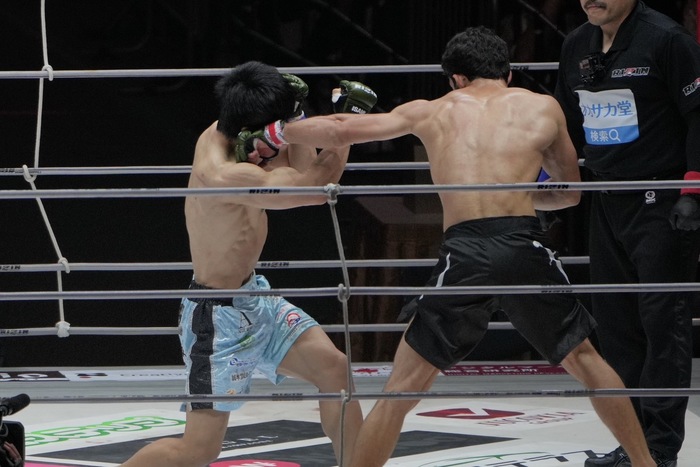2R、互いのスタミナはいかに。ガジャマトフの右フックをかわした征矢。ガジャマトフは左右の高い蹴り。かわす征矢に左フックを当てるガジャマトフ。左フックをを振る征矢。右ストレートをかわしたガジャマトフ。征矢は左ジャブを突き、左フックで飛び込み。互いに左の刺し合いも、征矢がじりじりと前に。