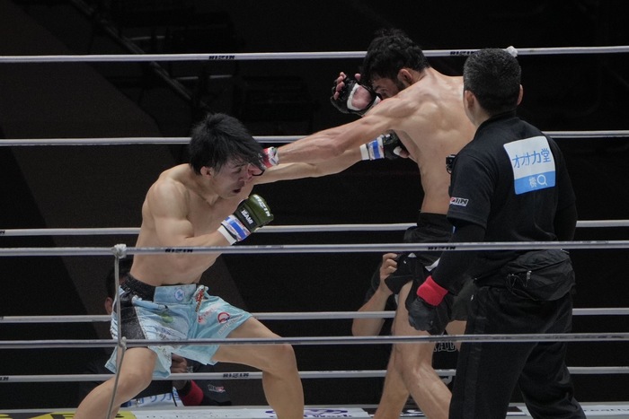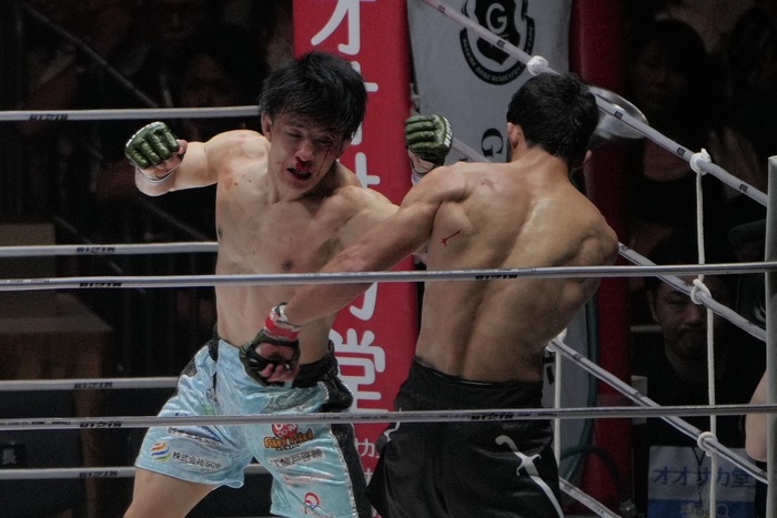 征矢の右に右の打ち下ろしのガジャマトフ。右跳びヒザを突くと、強いジャブ。征矢の右アッパーの打ち終わりに征矢の足が揃ったところに、右から左フック! 後方に倒れた征矢にガジャマトフは鉄槌連打! レフェリーが間に入った。左瞼をカットしている征矢。